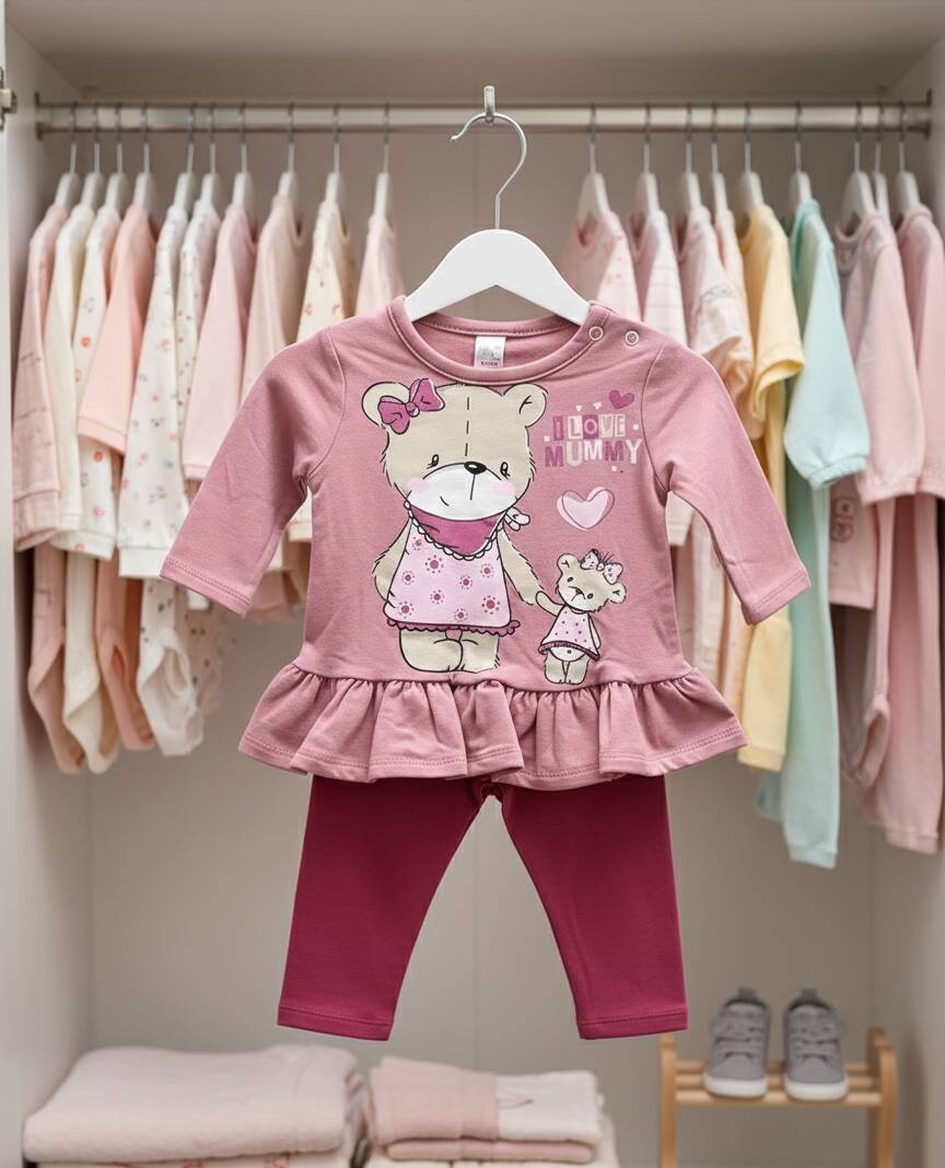 • Горнище: Туника в нежен цвят пепел от рози с дълъг ръкав. Акцентът е голяма щампа на мечета и надпис „I Love Mummy“. Завършва с красиви къдрички тип „пеплум“. Тик-так копчета на рамото за лесно обличане.